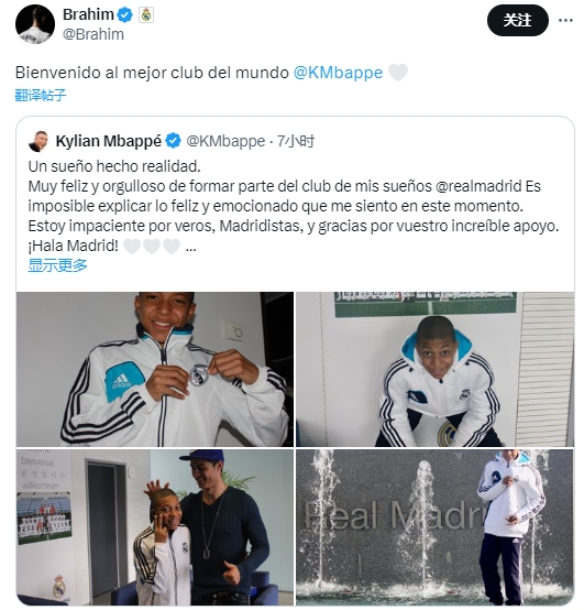 迪亚斯在推特上转发了姆巴佩加盟皇马的推文,并表示:“欢迎来到世界上最好的俱乐部,姆巴佩。”并配上了一个心形图标。