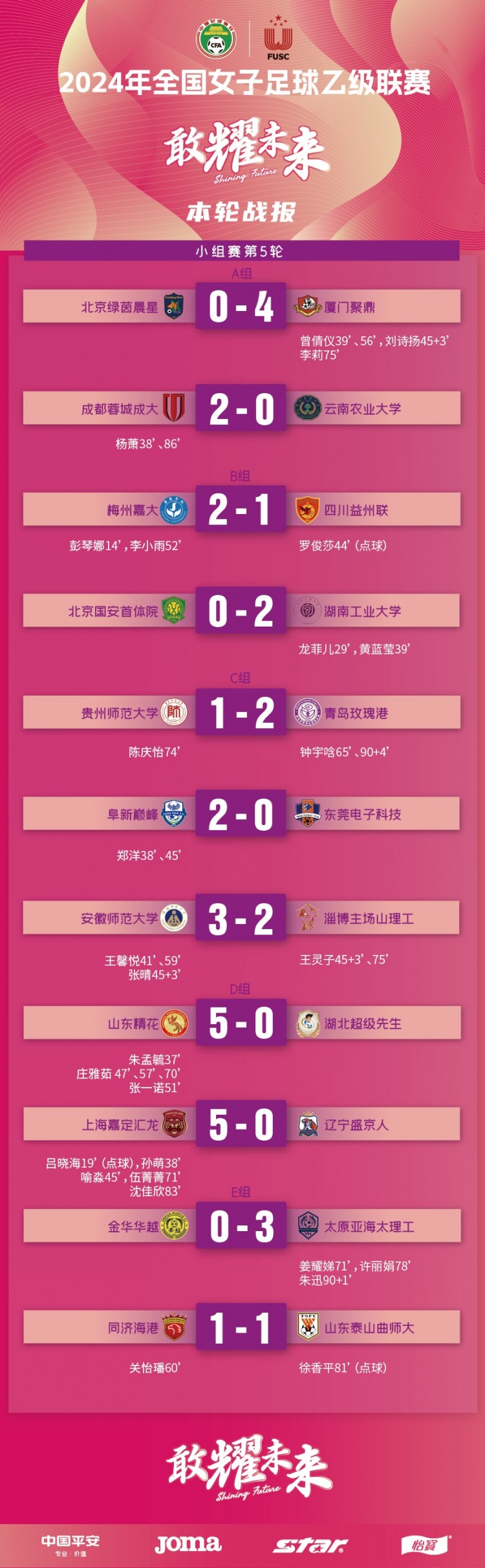 5月31日,2024年全国女子足球乙级联赛小组赛阶段结束,厦门聚鼎队、湖南工业大学队、青岛玫瑰港队、上海嘉定汇龙队、太原亚海太理工队分列各小组头名,与其他11支球队一起晋级排位赛阶段。