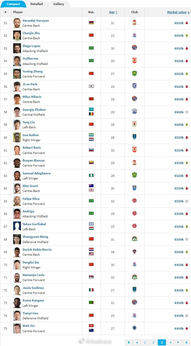 中超球员前20名身价如下(单位:欧元):