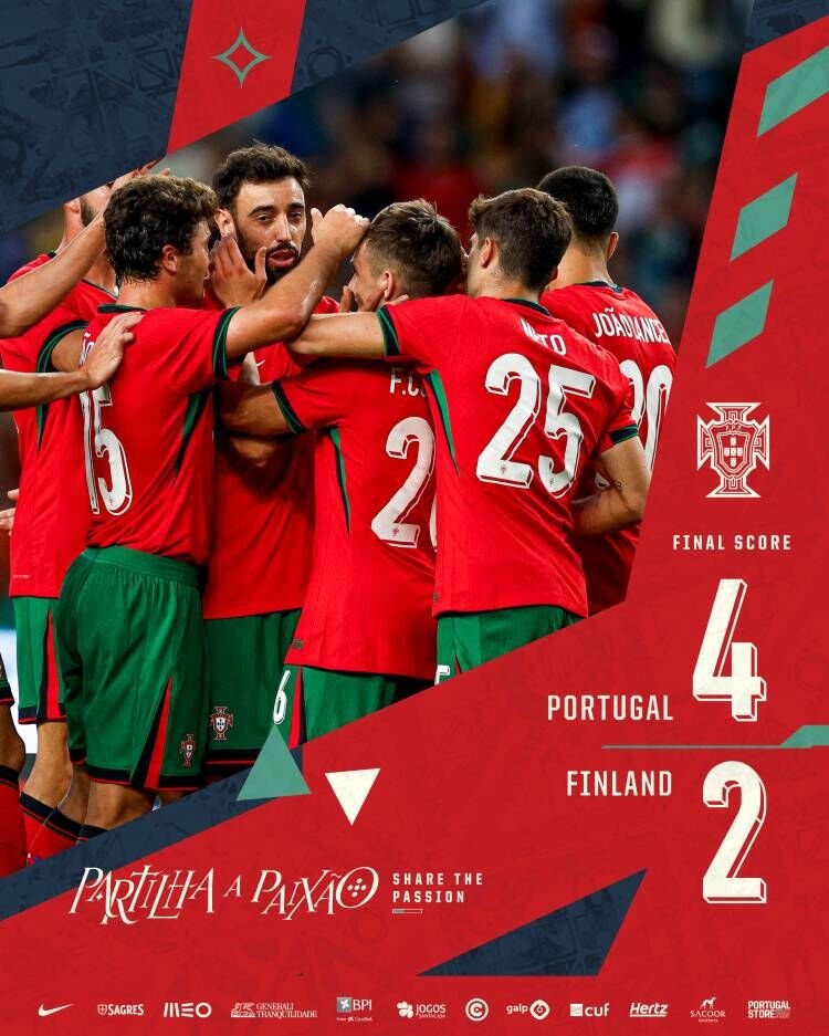 国际友谊赛,葡萄牙4-2芬兰。上半场,迪亚斯头球首开记录,孔塞桑造点若塔点射扩大比分;下半场,孔塞桑助攻B费世界波破门,普基替补双响,B费推射锁定胜局。