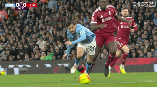 11月10日讯 曼城vs利物浦第15分钟,B席踉跄前插追球,一脚铲翻范戴克。