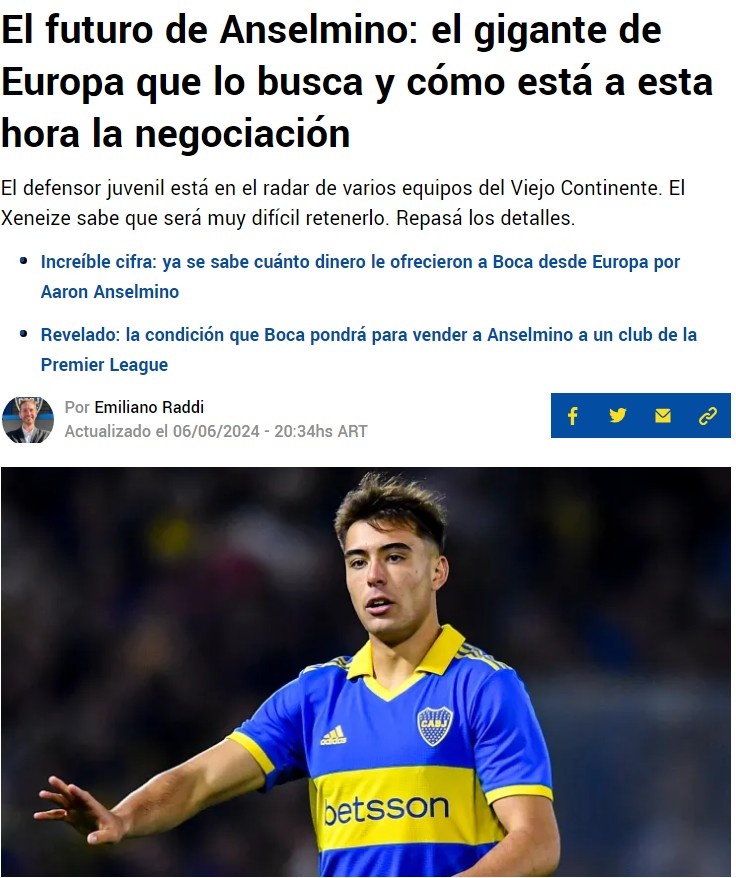 19岁的安塞尔米诺是一名阿根廷中后卫,目前效力于博卡青年,俱乐部知道他们很难留住球员,并预计未来几周会有欧洲球队为他送上报价。