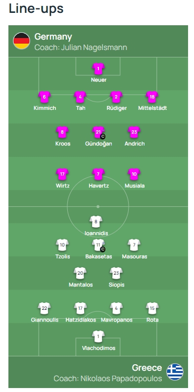 德国首发:1-诺伊尔、6-基米希、4-若纳坦-塔、2-吕迪格、18-米特尔施泰特、21-京多安、8-克罗斯、23-安德里希、17-维尔茨、10-穆西亚拉、7-哈弗茨