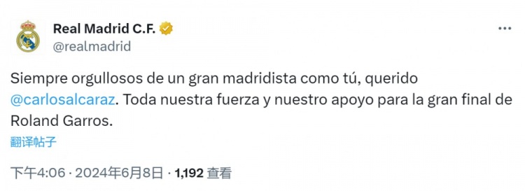 皇马官方账号在社交媒体上写道:“永远为你这样的杰出皇马球迷感到骄傲,亲爱的阿尔卡拉斯,法网决赛我们全力为你加油。”
