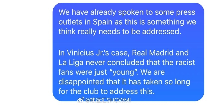 06月09日讯 博主“球迷汇SHOWMI”发文,更新了关于欧冠决赛后被来自西班牙的球迷种族歧视的后续,表示已经来自当事人父亲的道歉,仍希望能够尽快得到涉事球迷本人的正式道歉,和皇马官方对此番种族歧视事件的回应。