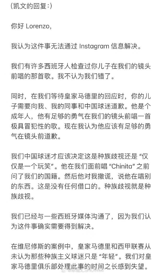 直到今天,我和对方的交涉仍在继续,希望他督促他的儿子勇敢面对、承认自己的错误,站出来向中国球迷正式道歉,但这一点对方目前仍未接受;我们也还在等待来自西甲和皇家马德里俱乐部的回应。但是我可以向大家保证,这件事情从发生到现在,我一直没有退缩。我一直坚持自己的立场和诉求,现在得到了阶段性的成果:来自当事人父亲的道歉。