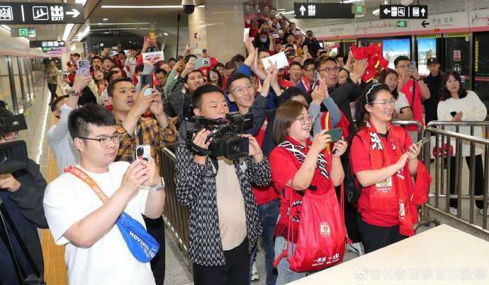 发放完联名乘车体验卡,吴亚轲、李申圆、贝里奇与球迷一同乘坐地铁前往6号线终点站长影世纪城站。
