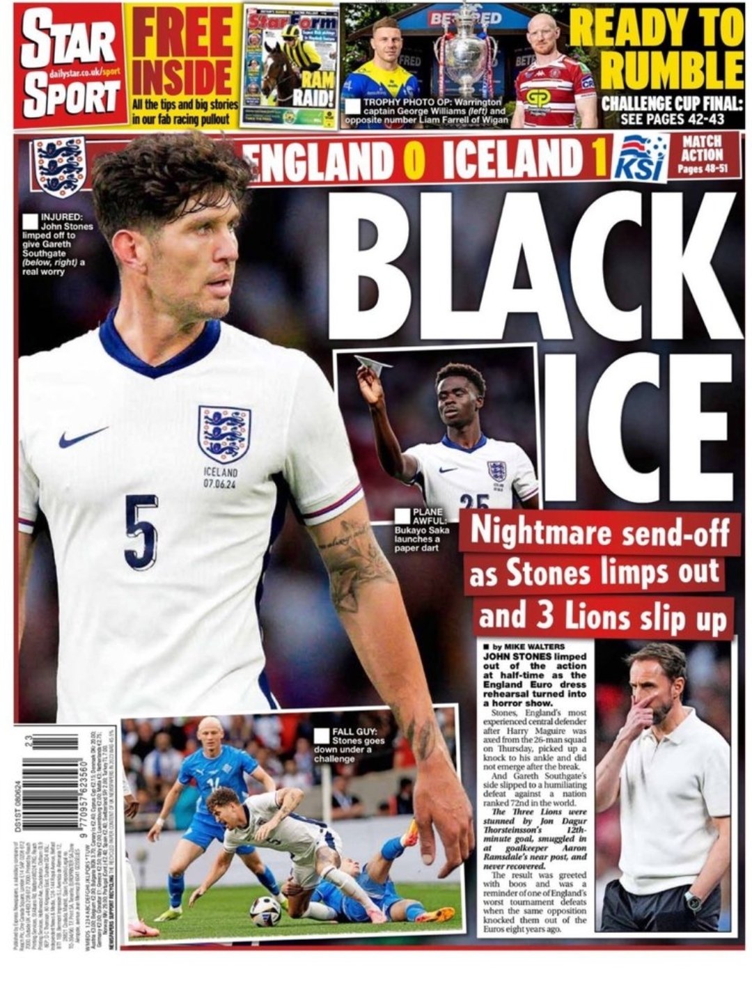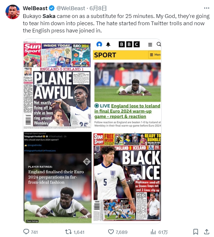 昨晚,英格兰队在欧洲杯前的友谊赛中以0-1输给冰岛。萨卡在下半场替补出场,总共踢了24分钟。今天早上,数十家报纸和报道将萨卡的形象作为失败的代言人,尽管英格兰队失球时他甚至不在球场上。