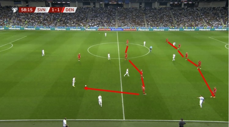 在这场对阵斯洛文尼亚的比赛中,我们就能明显看到丹麦的5-4-1防守阵型。边翼卫收缩,与三名中后卫组成了站位较高的五后卫防线。达姆斯加德、埃里克森、霍伊别尔和奥尔森则是在中线附近平行站位,抵御对手的进攻。当斯洛文尼亚向后传递之时,达姆斯加德主动向前进行逼抢,而霍伊别尔也随即跟进。迫使对方持球者不得不尝试用长传球来撕开丹麦的防线——显然,丹麦身材高大的中后卫并不害怕处理高空球。