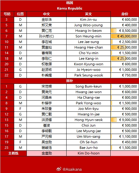 2026年美加墨世界杯亚洲区预选赛 韩国vs中国 首发名单