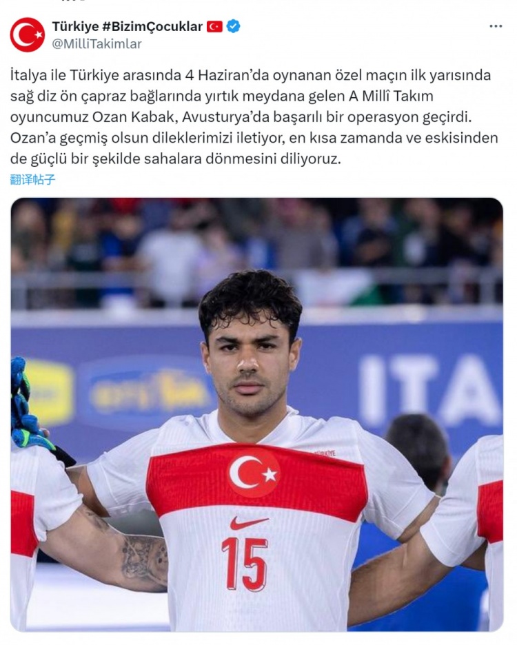 土耳其24岁中卫卡巴克在对阵意大利的热身赛中右膝前十字韧带撕裂,无缘本届欧洲杯,土耳其队官方确认卡巴克在奥地利成功接受手术,并祝愿他早日康复。