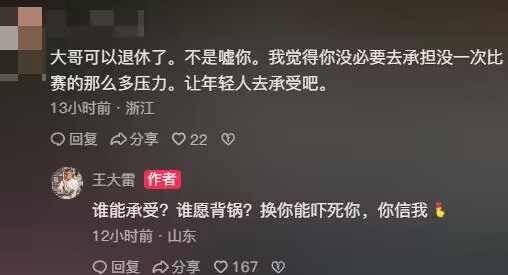 网友:大哥可以退休了,不是嘘你。我觉得你么必要去承担没(每)一次比赛那么多压力,让年轻人去承受吧。