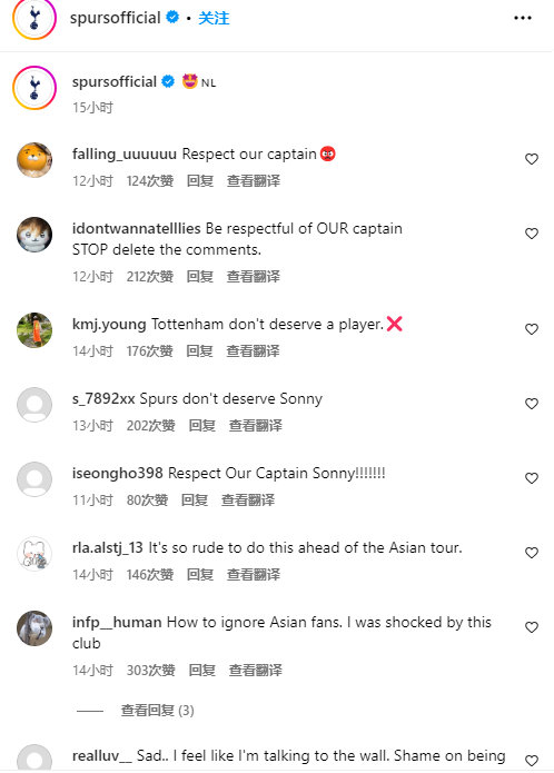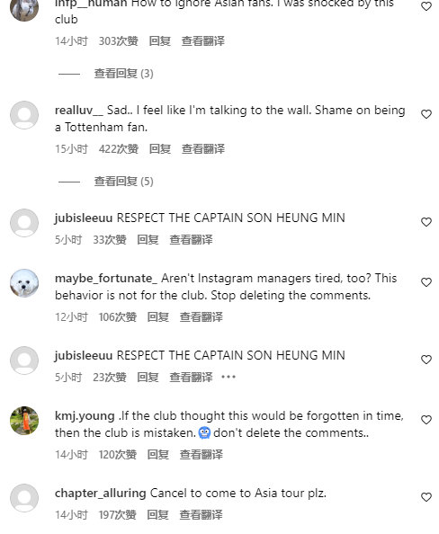 【社媒沦陷】继本坦库尔言论涉嫌歧视孙兴慜和亚洲人后(虽然球员本人在社媒公开道歉,但韩国球迷对热刺官方没有发声甚至删除相关评论的行为非常不满,纷纷在官方instagram评论。