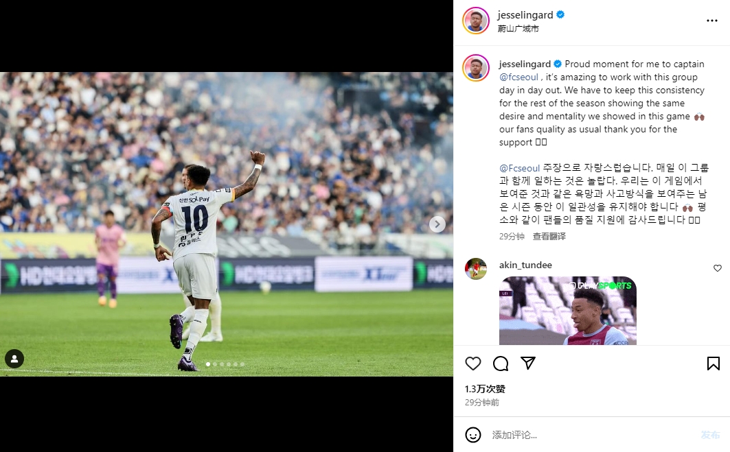 林加德晒出任首尔FC队长照:非常骄傲,很高兴和团队并肩作战