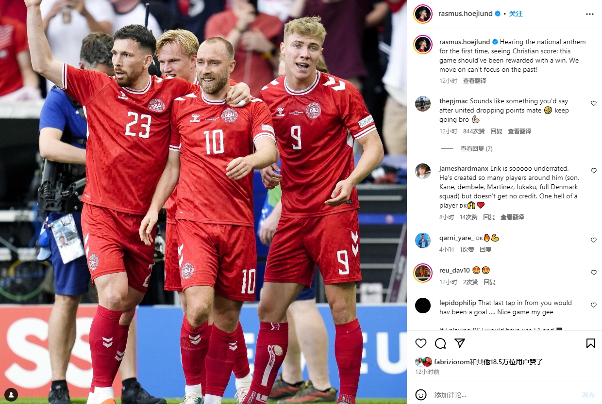 丹麦前锋霍伊伦在社交媒体上晒出与埃里克森的赛场合照,并写道:“听到国歌首次在(本届欧洲杯)赛场响起,并看到埃里克森进球。这场比赛本应该以胜利告终。让我们继续前进,不能沉溺于过去。”