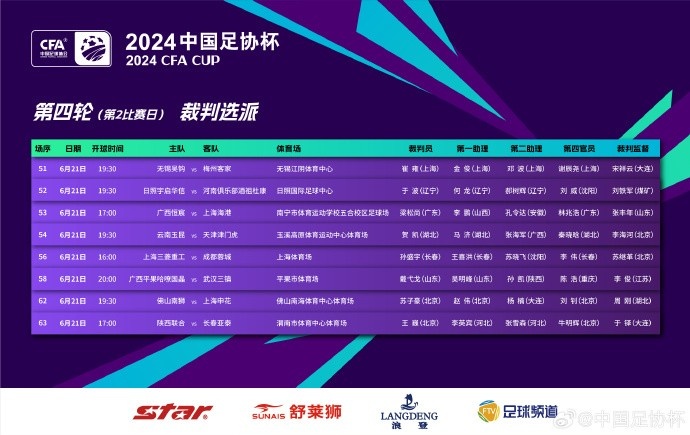 6月21日讯 足协杯官方公布了第四轮第2比赛日的裁判人员名单,具体如下:
