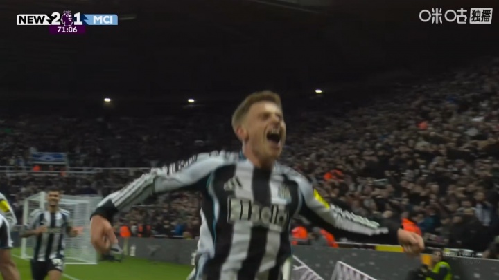 11月23日讯 曼城vs纽卡第71分钟,曼城禁区乱战,巴恩斯破门!双响了!此时比分变为纽卡2-1!