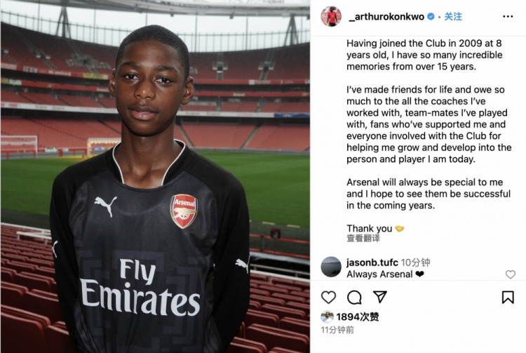 告别母队!奥孔科沃:15年太多难忘回忆,希望阿森纳未来取得成功