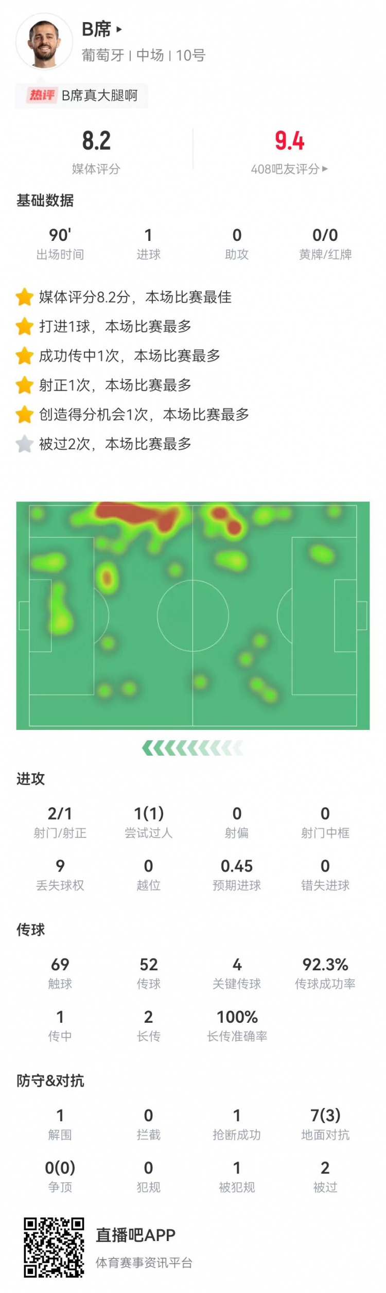B费全场数据:打进1球,两次长传全部成功&3次铲断