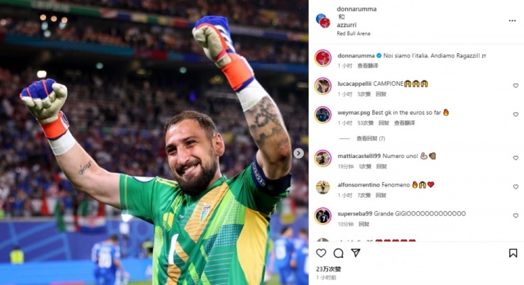 6月25日讯 意大利在本轮欧洲杯1-1绝平克罗地亚,完成扑点并做出多次精彩扑救的多纳鲁马在赛后发文纪念晋级。