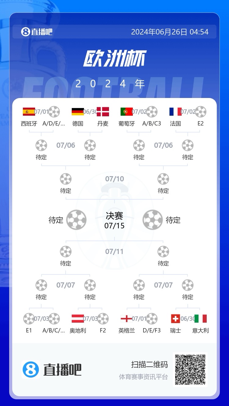 欧洲杯16强出炉11席:法西德葡死亡半区 英意同半区
