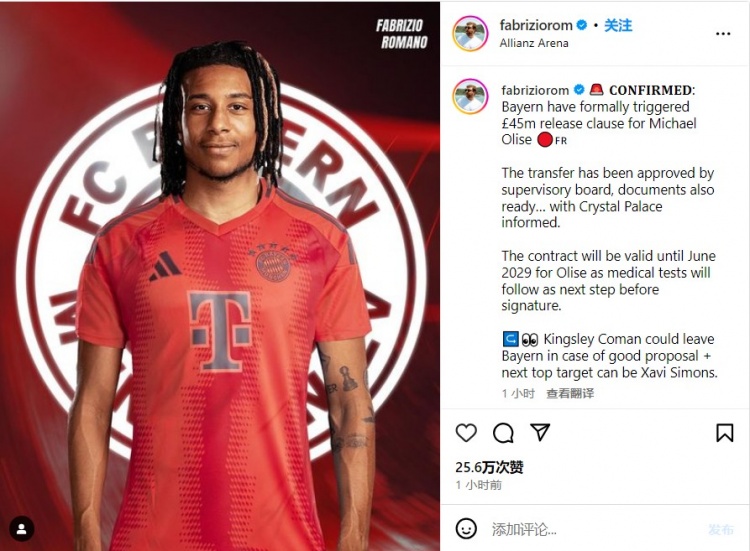 罗马诺:拜仁正式激活奥利斯4500万镑解约金条款,签约5年