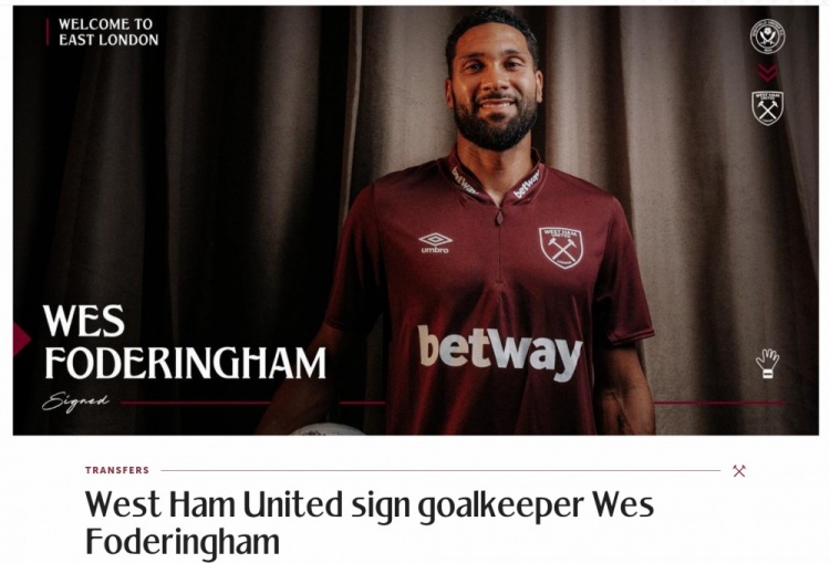 官方:西汉姆免签33岁门将福德林汉姆,双方签下两年合同