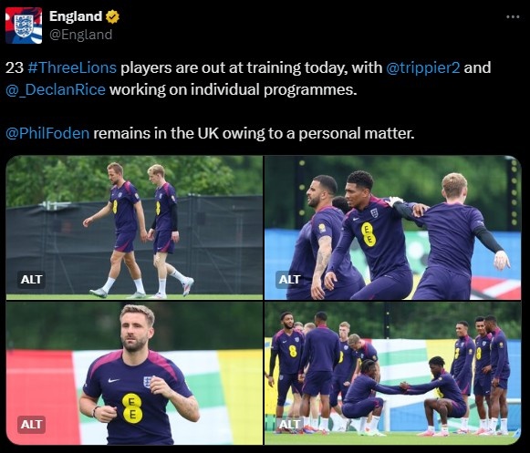 英格兰训练情况:卢克肖参与,赖斯特里皮尔单独训练,福登缺席