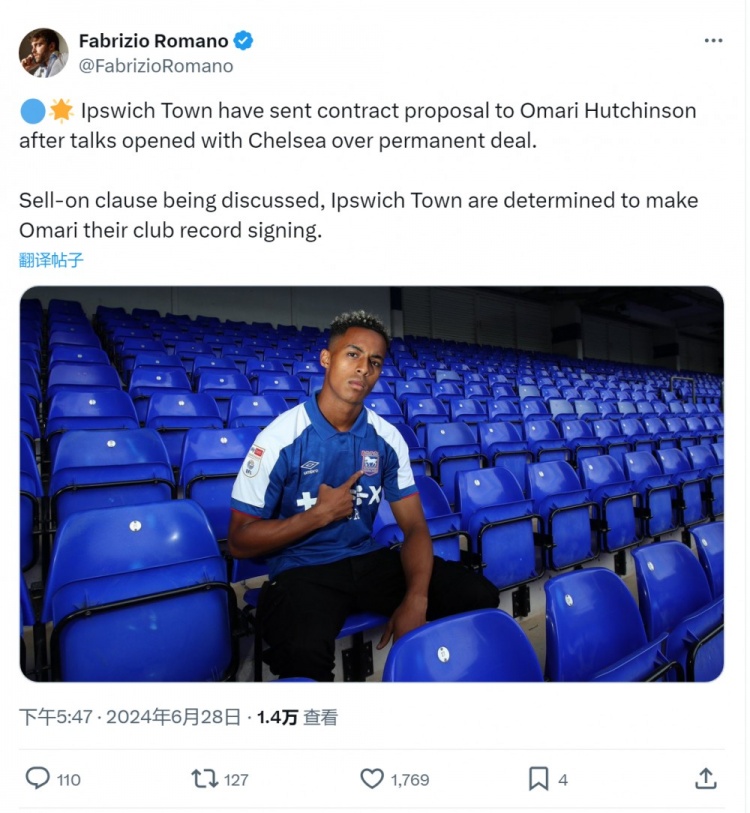 罗马诺:伊普斯维奇与蓝军商谈哈钦森转会,已向球员提交合同报价
