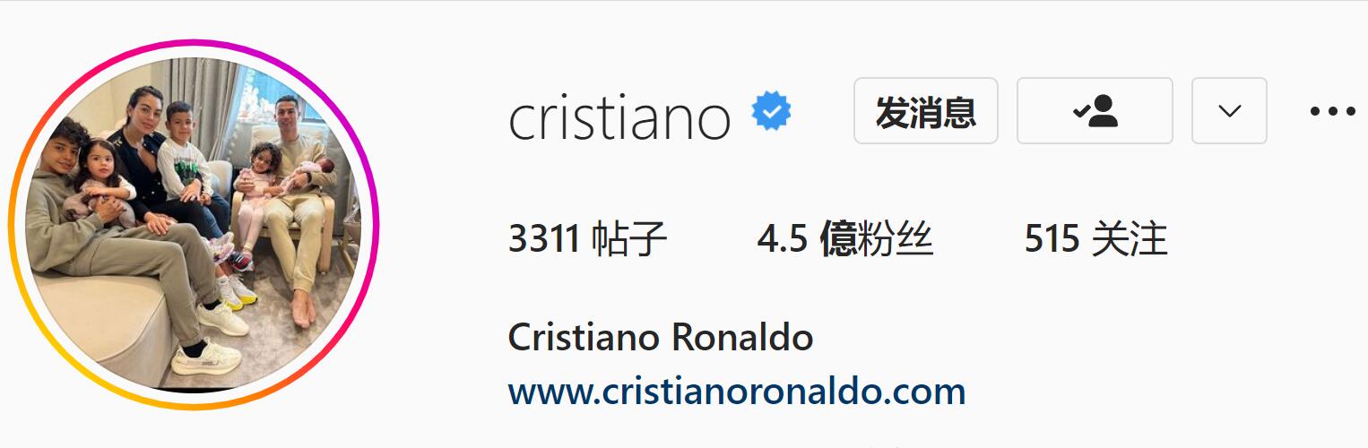6月7日讯 C罗在社交媒体Instagram的粉丝数量达到4.5亿,全球首人。