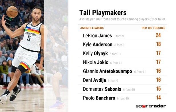 6尺9寸及以上球员前场每百次触球助攻:李凯尔18次 仅次于老詹