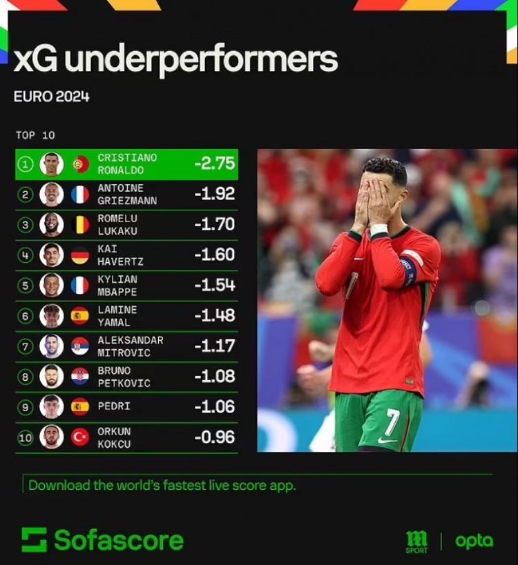 7月3日讯 《每日邮报》报道,根据sofascore的数据统计,C罗是本届欧洲杯预期进球与实际进球差值最大的球员,他预期进球为2.75个,实际进球为0个。