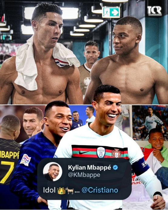 后来,姆巴佩和C罗在欧国联有了第一次国家队交手,两人在中圈处寒暄交谈,互相开着玩笑。赛后,姆巴佩在推特上发了自己与C罗的合照,并且写道:“偶像”。同时还加上了王冠和象征历史最佳的山羊标记。