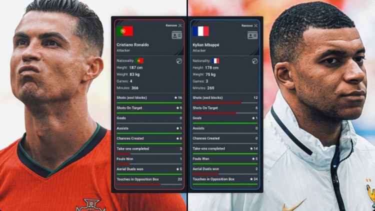 7月5日讯 欧洲杯1/4决赛,葡萄牙对阵法国,数据网站Squawka对比了两队锋线大将C罗和姆巴佩本届欧洲杯的数据。