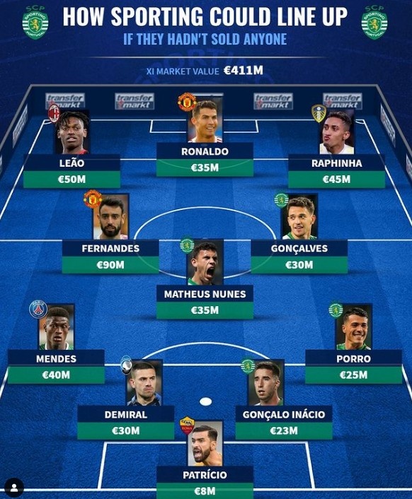 6月7日讯 《转会市场》列出了葡萄牙体育“如果没有卖人”的现役最贵阵容,C罗领衔,当前阵容中有4将入围。