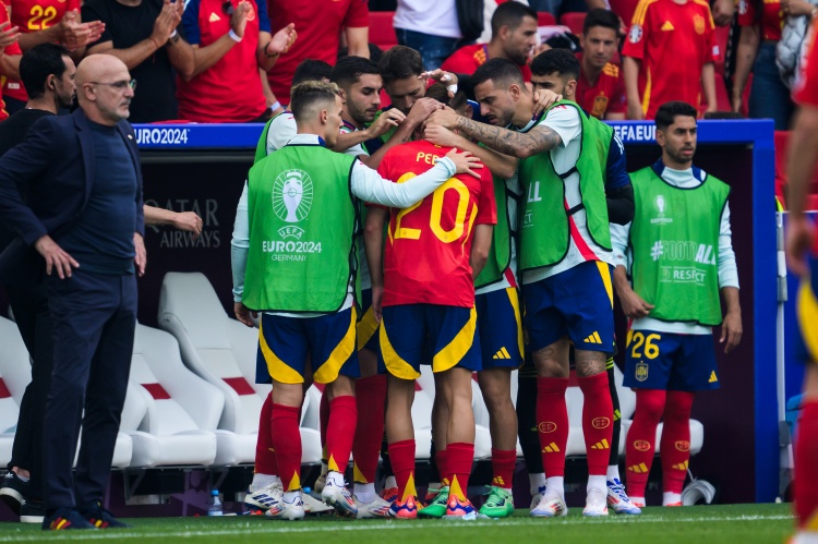 7月6日讯 欧洲杯1/4决赛,德国对阵西班牙的比赛正在进行。上半场第7分钟,佩德里受伤下场。