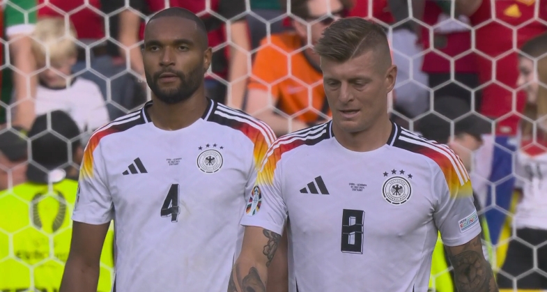07月06日讯 欧洲杯1/4决赛,西班牙vs德国,比赛第51分钟,奥尔莫破门,西班牙1-0领先德国,丢球后的京多安和克罗斯一脸无奈。