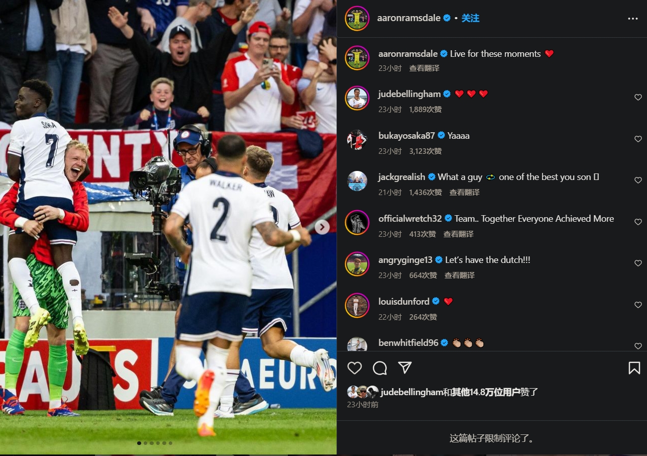 拉姆斯代尔社媒晒图庆祝英格兰晋级四强:为这些时刻而活❤