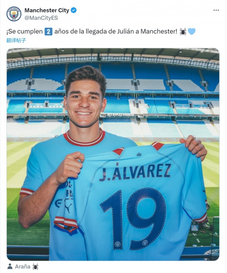 两年前的今天阿尔瓦雷斯加盟曼城,至今为蓝月出战103场36球18助