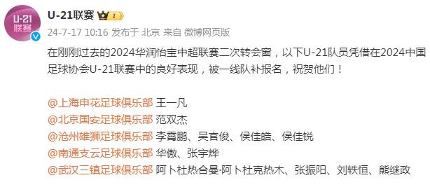U21联赛官博向这些球员祝贺写道: