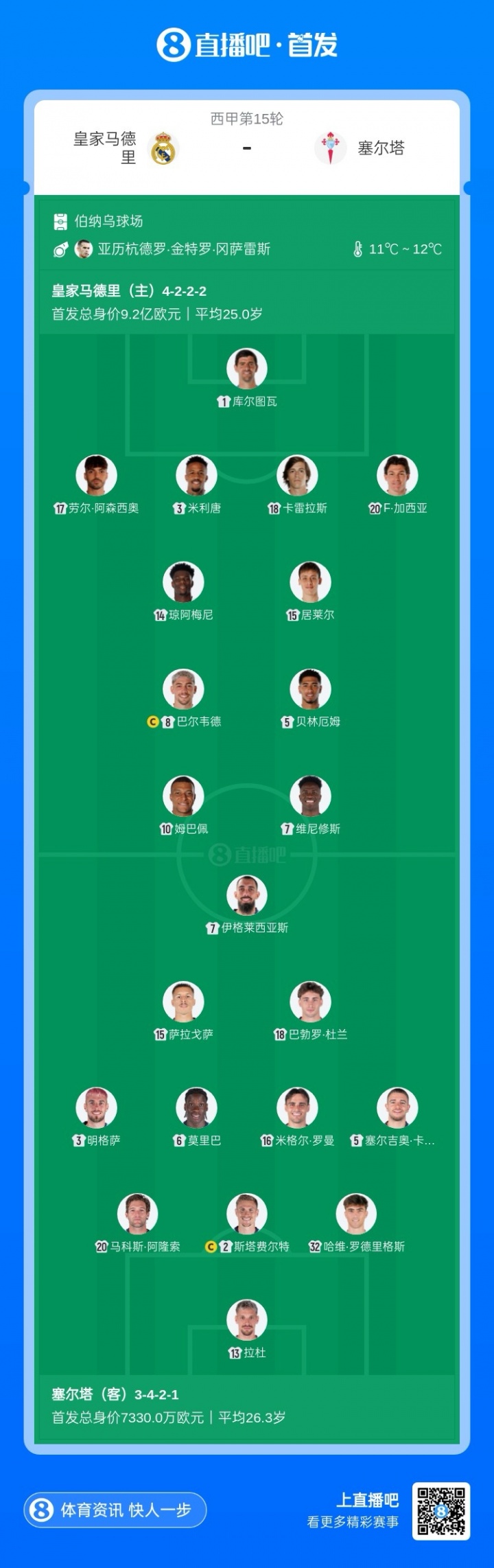 皇家马德里首发:1-库尔图瓦、17-阿森西奥、3-米利唐、18-卡雷拉斯、20-弗兰·加西亚、8-巴尔韦德、14-琼阿梅尼、15-居莱尔、5-贝林厄姆、7-维尼修斯、10-姆巴佩