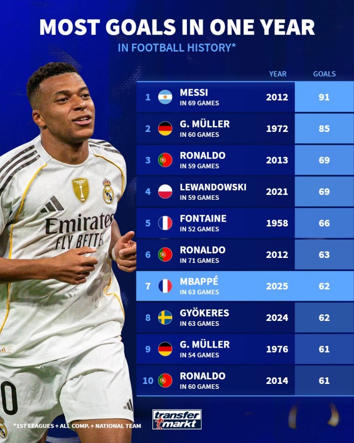 12月08日讯姆巴佩今年进球已达62球,进入历史前十,德转盘点了足坛历史自然年进球纪录。