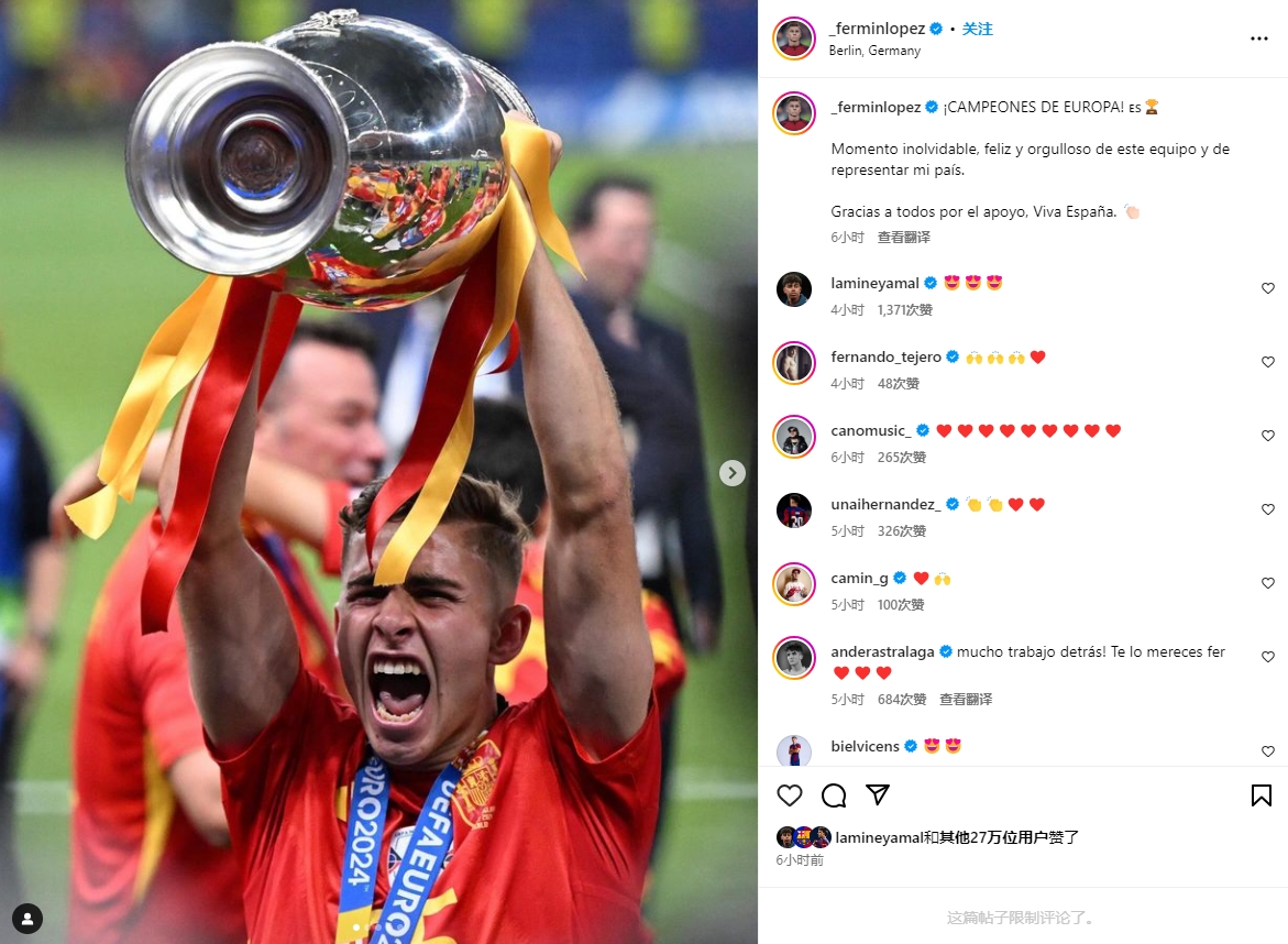 费尔明晒出捧杯照片,并配文写道:“西班牙是欧洲冠军!难忘的时刻,我很高兴也很自豪代表这支球队,代表我的国家。”