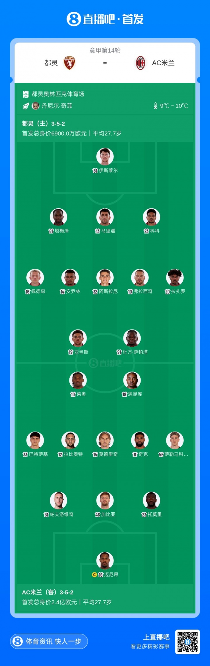 都灵首发:81-伊斯莱尔、13-马里潘、16-马库斯·佩德森、20-拉扎罗、14-安乔林、32-阿斯拉尼、61-塔梅泽、10-弗拉西奇、19-切·亚当斯、23-索尔·科科、91-杜万·萨帕塔