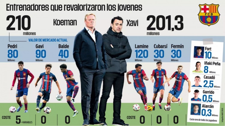 而在哈维手下,亚马尔、费尔明、库巴西、福特、佩尼亚、卡萨多、加里多和阿拉尔孔等青训球员获得了首秀机会,现在亚马尔身价1.2亿欧元,库巴西身价3000万欧元,费尔明身价3000万欧元,福特身价1000万欧元,佩尼亚身价800万欧元,卡萨多身价250万欧元,加里多身价50万欧元,阿拉尔孔身价30万欧元。