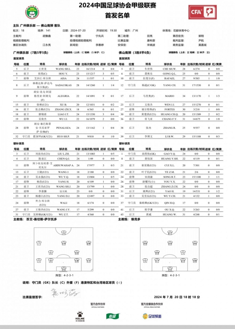 7月20日讯 今晚19:30,中甲联赛第18轮比赛将迎来“广东德比”,广州队主场迎战佛山南狮。目前双方首发已公布,具体如下: