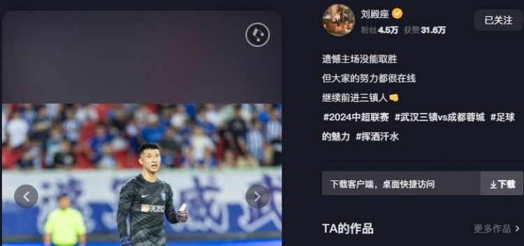 赛后,刘殿座在社媒发文:“遗憾主场没能取胜,但大家的努力都很在线,继续前进三镇人。”