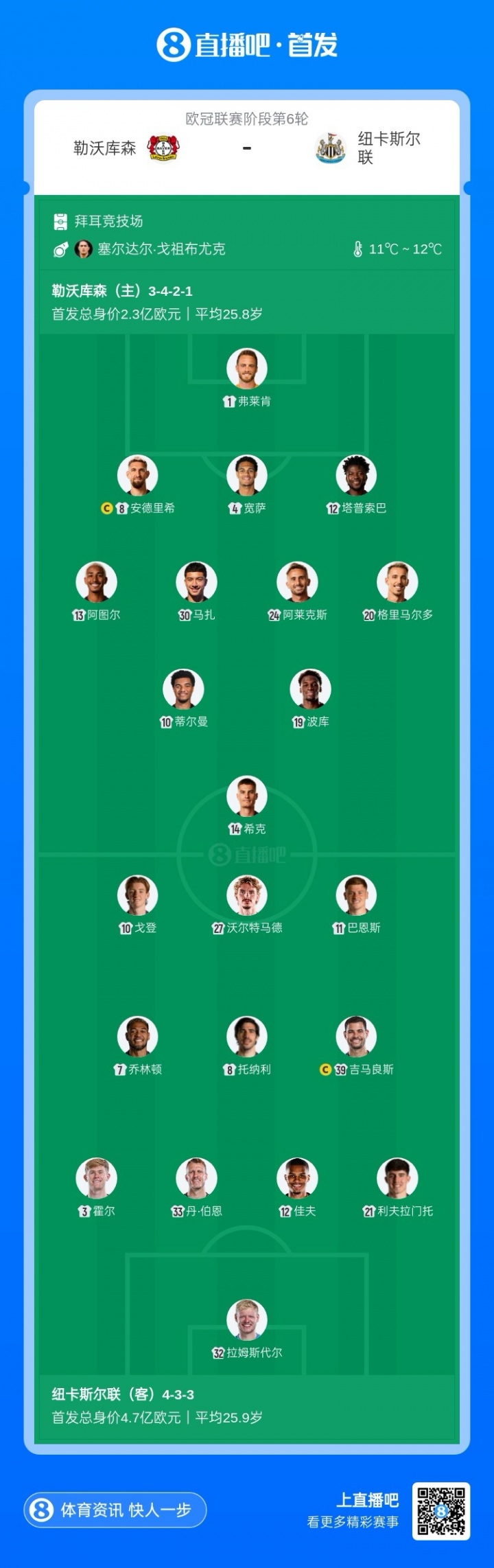 12月11日讯 欧冠联赛阶段第6轮,勒沃库森主场迎战纽卡斯尔联,赛前双方首发公布。