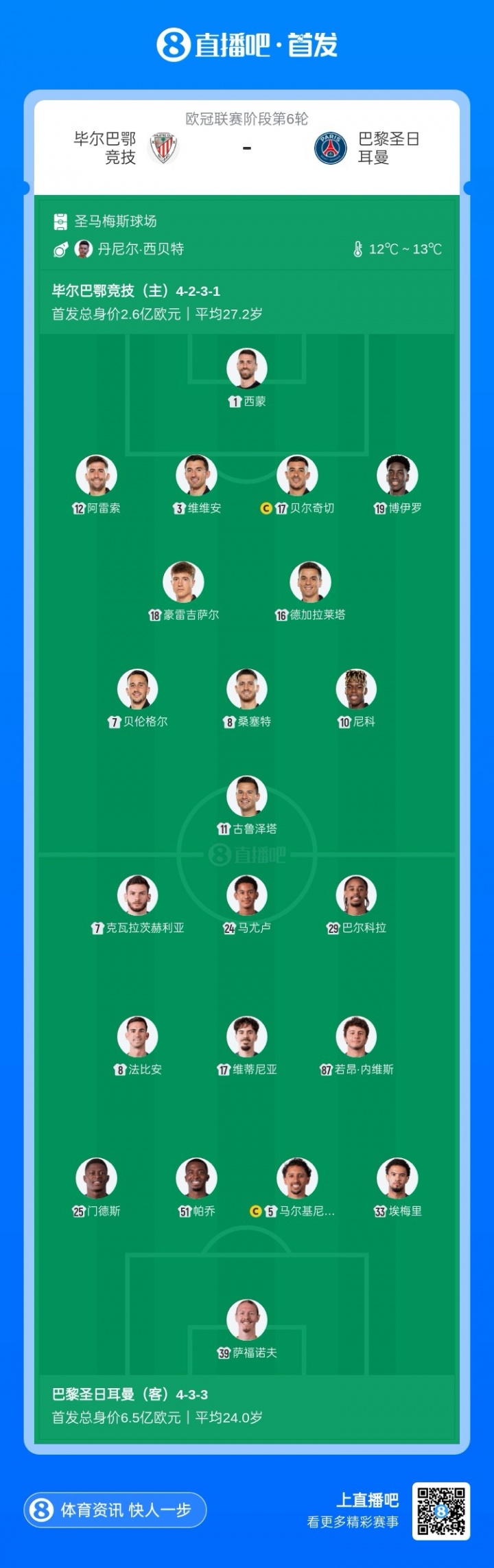 12月11日讯 欧冠联赛阶段第6轮,毕尔巴鄂竞技主场迎战巴黎圣日耳曼,赛前首发名单公布。