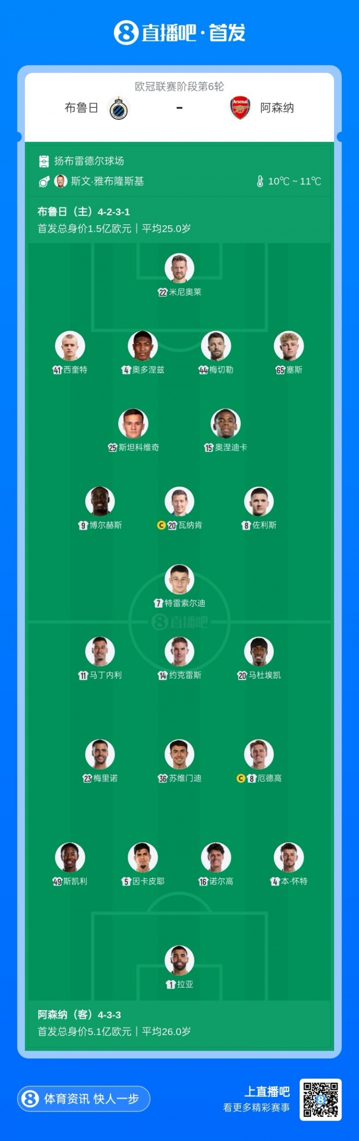 布鲁日首发:22-米尼奥莱、41-西奎特、4-奥多涅兹、44-梅切勒、65-塞斯、25-斯坦科维奇、15-奥涅迪卡、9-博尔赫斯、20-瓦纳肯、8-佐利斯、7-特雷索尔迪
